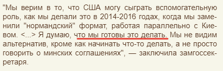 "Мы верим в то, что США могу сыграть вспомогательную роль, как мы делали это в 2014-2016 годах, когда мы заменили "нормандский" формат, работая параллельно с Киевом. <...> Я думаю, что мы готовы это делать. Мы не видим альтернатив, кроме как начинать что-то делать, а не просто говорить о минских соглашениях", — заключила замгоссекретаря.