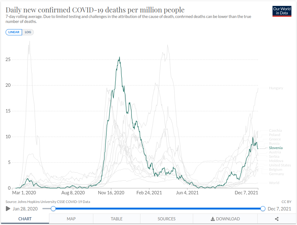 По данным ВОЗ, количество полностью вакцинированных в Словении составляет лишь 55%. Это самый низкий показатель в Европе. В то же время данные говорят, что количество ежедневных заражений сокращается.