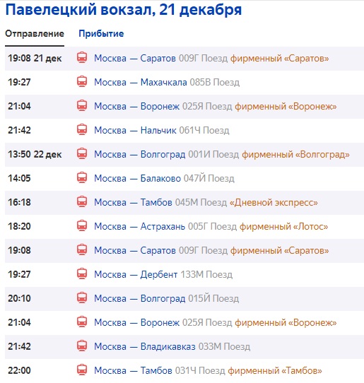 Правда, не очень понятно, почему испытывающий стыд за эту страну Мельников делает такие смелые обобщения, если он сам в первой фразе статьи сказал, что приехал на вокзал вечером. И, следовательно, сообщает только о тех поездах, которые остались до полуночи. А если бы он приехал к последнему поезду?... Давайте посмотрим, можно ли уехать из Москвы поездом куда-то ещё кроме пунктов "Астрахань, Саратов, Владикавказ, Дербент". Расписание задним числом за 18 декабря я не нашёл. Но вряд ли расписание на 21 декабря отличается каким-то радикальным образом: