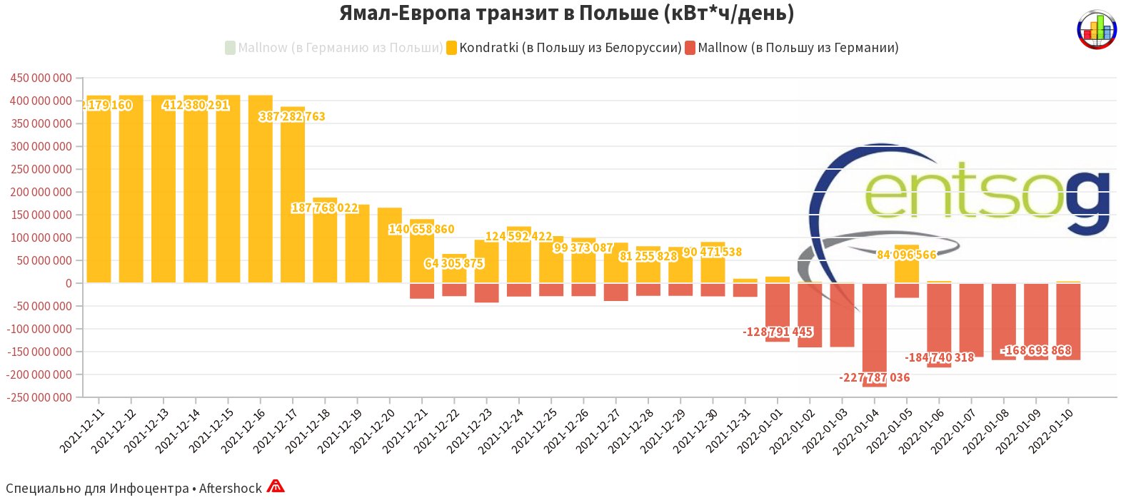 По сути первый скриншот - это вид работы компрессорной станции (КС) Мальнов на границе Польши и Германии. С 18-го декабря поток в Германию снизился до абсолютного минимума, то есть "Пульс транзита едва прощупывался" (это для тех, кто помнит такую тему). А уже с 21 декабря начался физический реверс, то есть газ начал поступать в Польшу из Германии и Новый Год ознаменовался заметным приростом этого физического реверса. На графике этот реверс спецально переведен в отрицательную зону, чтобы четко разделить оба потока не только цветом, но и направлением по положению относительно оси ОХ.