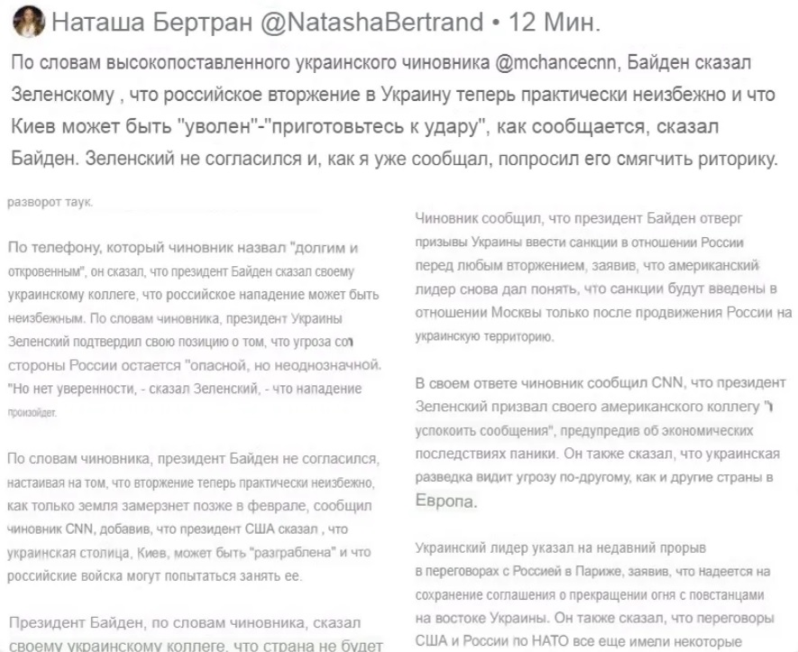 По телефону, который украинский чиновник назвал "долгим и откровенным", Байден предупредил своего украинского коллегу о том, что российское нападение может быть скорым, заявив, что вторжение теперь практически неизбежно, как только земля замерзнет в конце февраля.