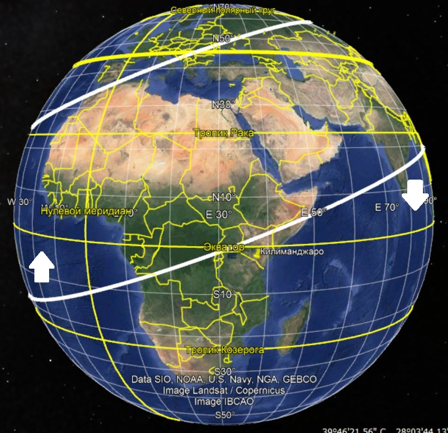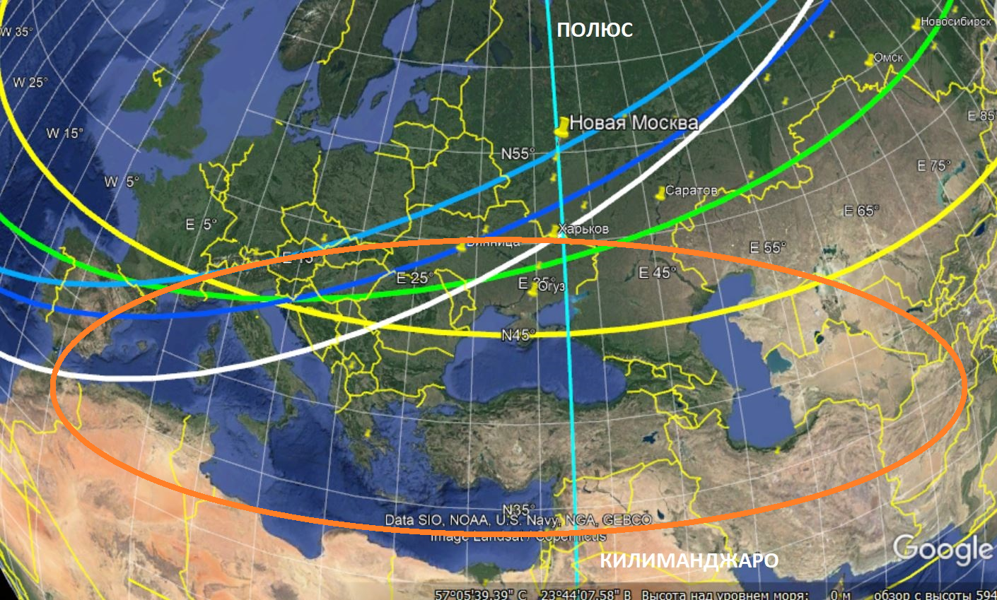 Цветные линии на рисунке обозначают северную границу ареала субтропических широколиственных (каштановых) лесов при разных смещениях Северного Полюса. Фактически человечество на раннем этапе своего развития угодило «колыбель», земной поверхности смещающейся под действием момента импульса, на основании «эффекта Джанибекова» или «теоремы промежуточной оси»,