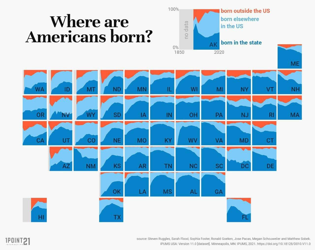 Любопытный демографический расклад по штатам США, а именно, место рождения жителей. Оранжевый - за пределами США, голубой - за пределами штата, синий - на территории штата