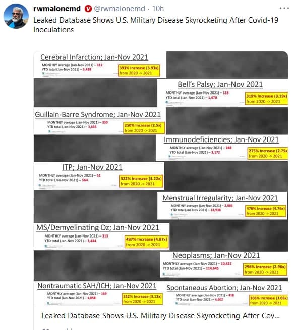 Об общей полезности mRNA вакцин применяемых к относительно здоровому населению, в данном случае US Military персонал - и совершенно случайно- о том, насколько можно доверять информации в базах данных по этому вопросу - разговор https://gettr.com/comment/cl6x3u0160 и видео где модно увидеть некоторые данные https://t.me/c/1456611092/594 , часть данных в виде картинки