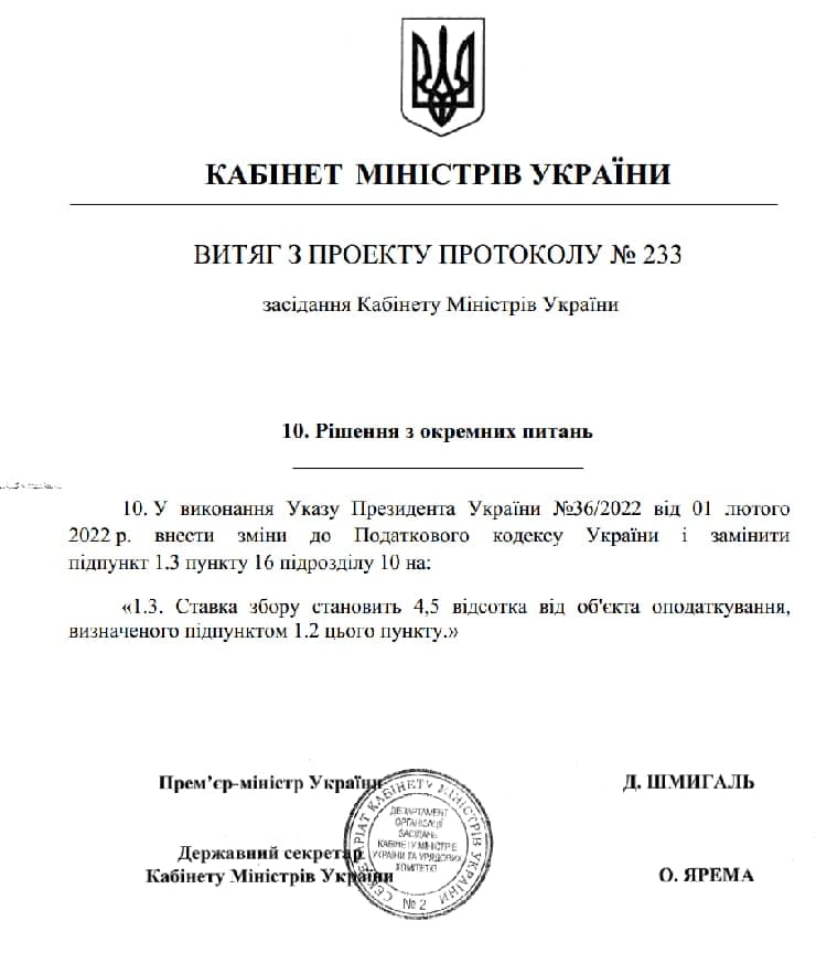 "Зеленский и Шмыгаль серьезно готовятся к войне и собираются платить за нее из кармана простых украинцев. Подтверждением тому является решение Кабинета министров об увеличении в три раза военного сбора, который с 1 марта текущего года составит 4,5% с любых доходов физических лиц (Приложение). Таким образом предполагается покрыть расходы на увеличение денежного довольствия военнослужащих согласно Указу президента Украины №36/2022 от 01 февраля 2022 г.