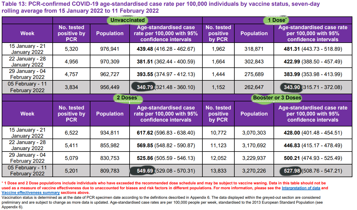 Таблица 13: Стандартизированная по возрасту частота случаев COVID-19, подтвержденная ПЦР, на 100 000 человек в зависимости от статуса вакцинации, семидневное скользящее среднее значение за период с 15 января 2022 января по 11 февраля 2022г