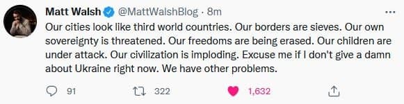 Саня из Флориды - "Реакция на события на Украине из США - "Наши города похожи на страны третьего мира. Наши границы - сита. Наш собственный суверенитет находится под угрозой. Наши свободы стираются. Наши дети под ударом. Наша цивилизация рушится. Извините, если мне сейчас наплевать на Украину. У нас другие проблемы."