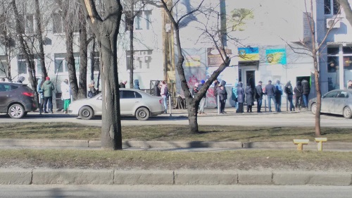 Прошелся по городу. Очереди везде. Банкоматы выдают по 1000 гривен за раз. Две по 500. В АТБ не протолкнуться. Отдельная очередь за хлебом. Всё гребут. Гребут столько сколько чего дают в одни руки. Но к 11 часам ажиотаж несколько спал. Соседка простояла в АТБ полтора часа. На работе в техникуме сказали никому не выходить до последующих указаний. В остальном всё спокойно. тепло, солнце светит.