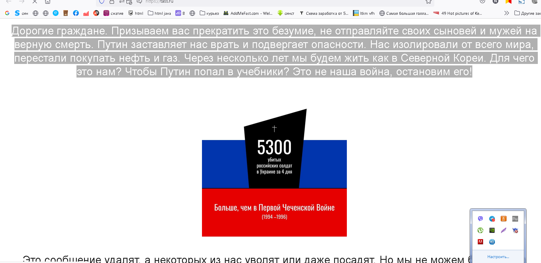 Дорогие граждане. Призываем вас прекратить это безумие, не отправляйте своих сыновей и мужей на верную смерть. Путин заставляет нас врать и подвергает опасности. Нас изолировали от всего мира, перестали покупать нефть и газ. Через несколько лет мы будем жить как в Северной Кореи. Для чего это нам? Чтобы Путин попал в учебники? Это не наша война, остановим его!
