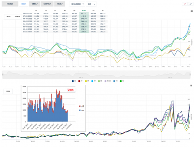 Оптовые цены на э-э на день вперед приблизились, а во Франции и Австрии превысили 500 евро за Мвтч согласно данным биржи nordpool. Это новый рекорд. На верхнем графике в тизере суточные цены с табличкой за последние восемь дней. На нижнем графике средне-недельные цены. В нем же суточное производство э-э ветряками. С начала года пр-во э-э ветряками выше примерно на 12%, чем в прошлом году. Но в последние дни - невысокое.