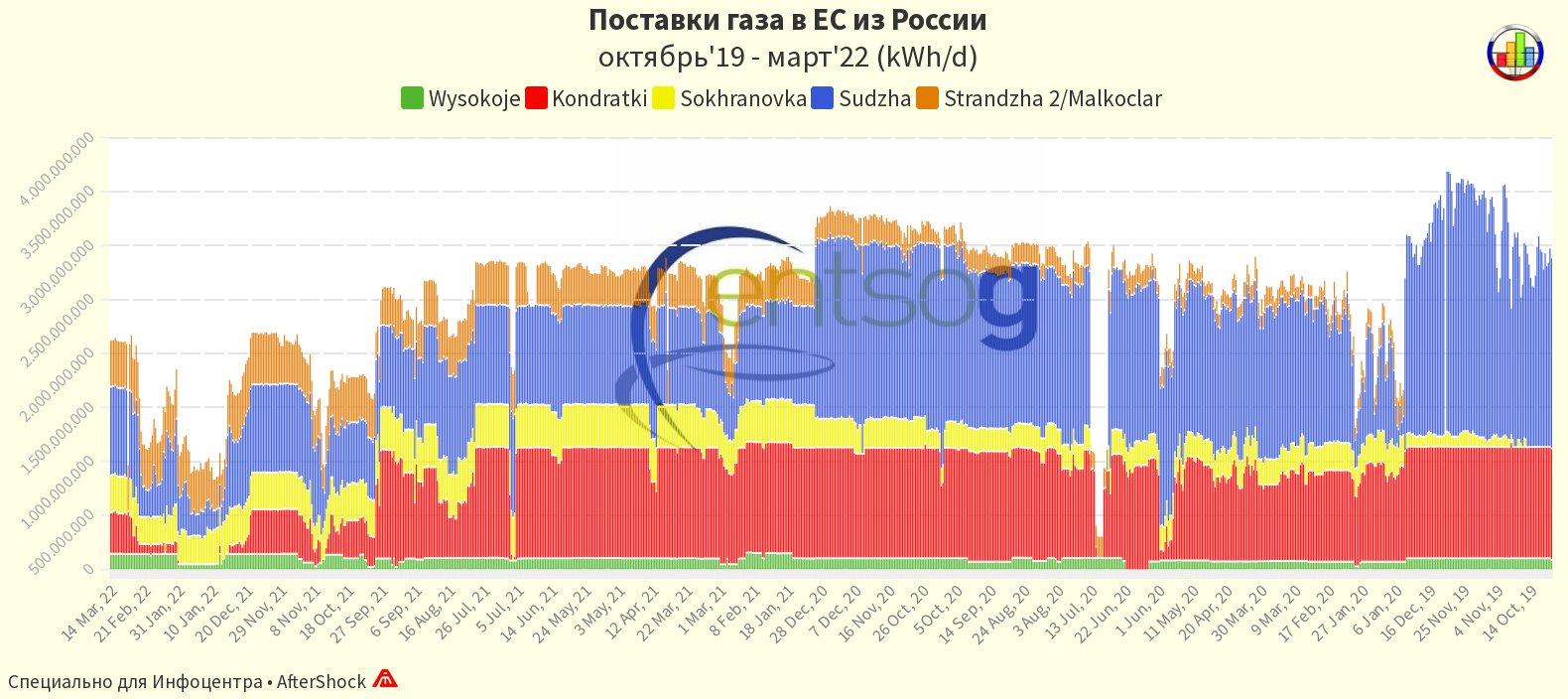 Данные предоставлены в энергетическом эквиваленте в киловатт-часах за день и оставим вопрос коэффициента пересчета за скобками. Отметим только общую цифру накопительной диаграммы примерно на уровне 2 150 000 000 кВт*ч в день на середину марта. Но это не все, что потребуется заместить, потому что есть еще СП-1, который в сутки подает... не буду делать новый скрин, есть немного устаревший, но не утративший актуальность... еще примерно 1 750 000 000 кВт*ч в день. Итого получаем порядка 4 млрд. кВт*ч каждый день. И это не считая Сияния Севера и прочего там СПГ.