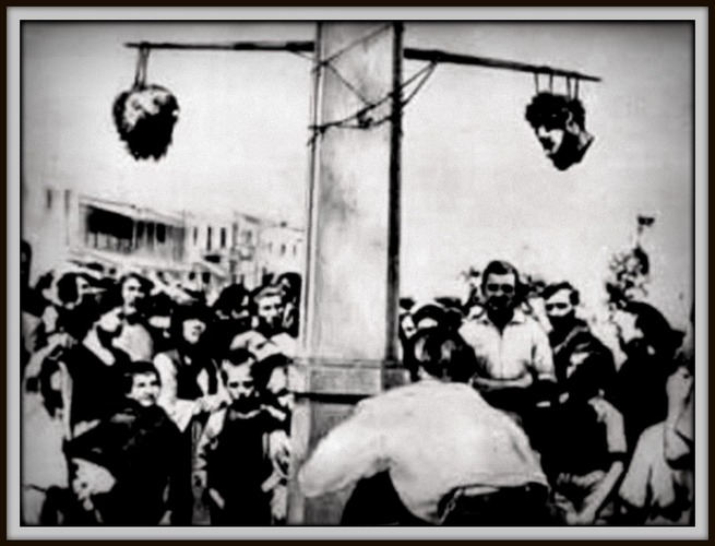 Отрубленные монархистами головы Ариса Велухиотиса и его адъютанта Дзавеласа, выставленные на площади города Трикала 1945.