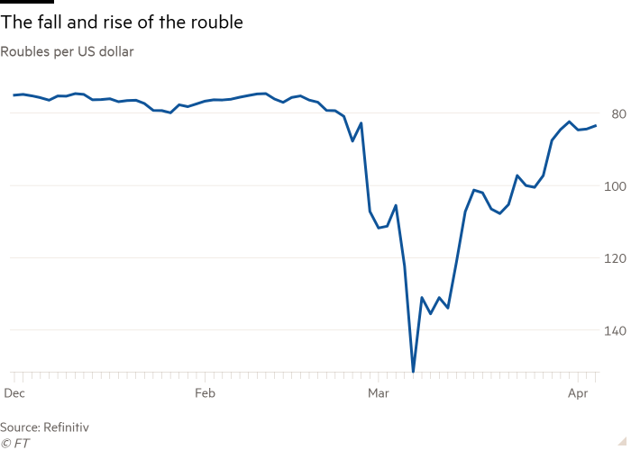 Через шесть недель после начала войны ситуация выглядит по—другому - по крайней мере, внешне. Рубль восстановил большую часть позиций, которые он потерял в первые дни после того, как было впервые объявлено о санкциях, что побудило некоторых российских чиновников заявить, что эти меры провалились.