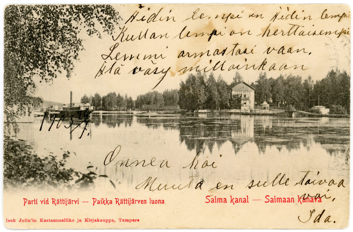 Открытка 1903 года с изображением усадьбы и парохода на озере Саймаа. Изображение: Etelä-Karjalan museo