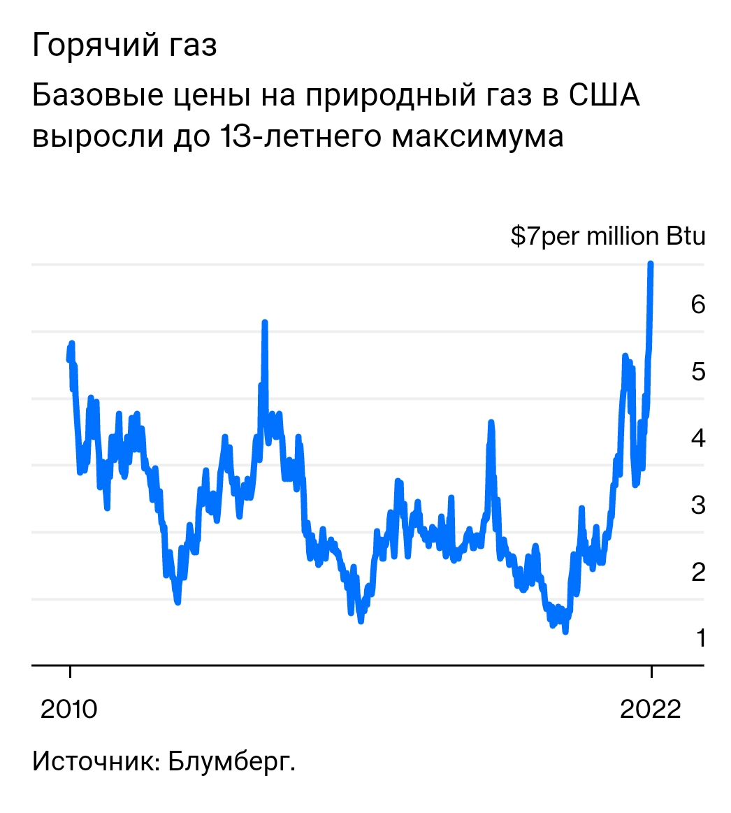 В понедельник цена эталонного газа в США подскочила до 13-летнего максимума, превысив 8 долларов за миллион британских тепловых единиц, что более чем вдвое превышает среднюю цену, которую американцы платили в 2010-2020 годах, составлявшую около 3,3 долларов за миллион британских тепловых единиц. Несмотря на то, что европейские потребители платят более 30 долларов за миллион британских тепловых единиц, они все еще составляют небольшую долю, но американские цены уже ощущают давление спроса на континенте.