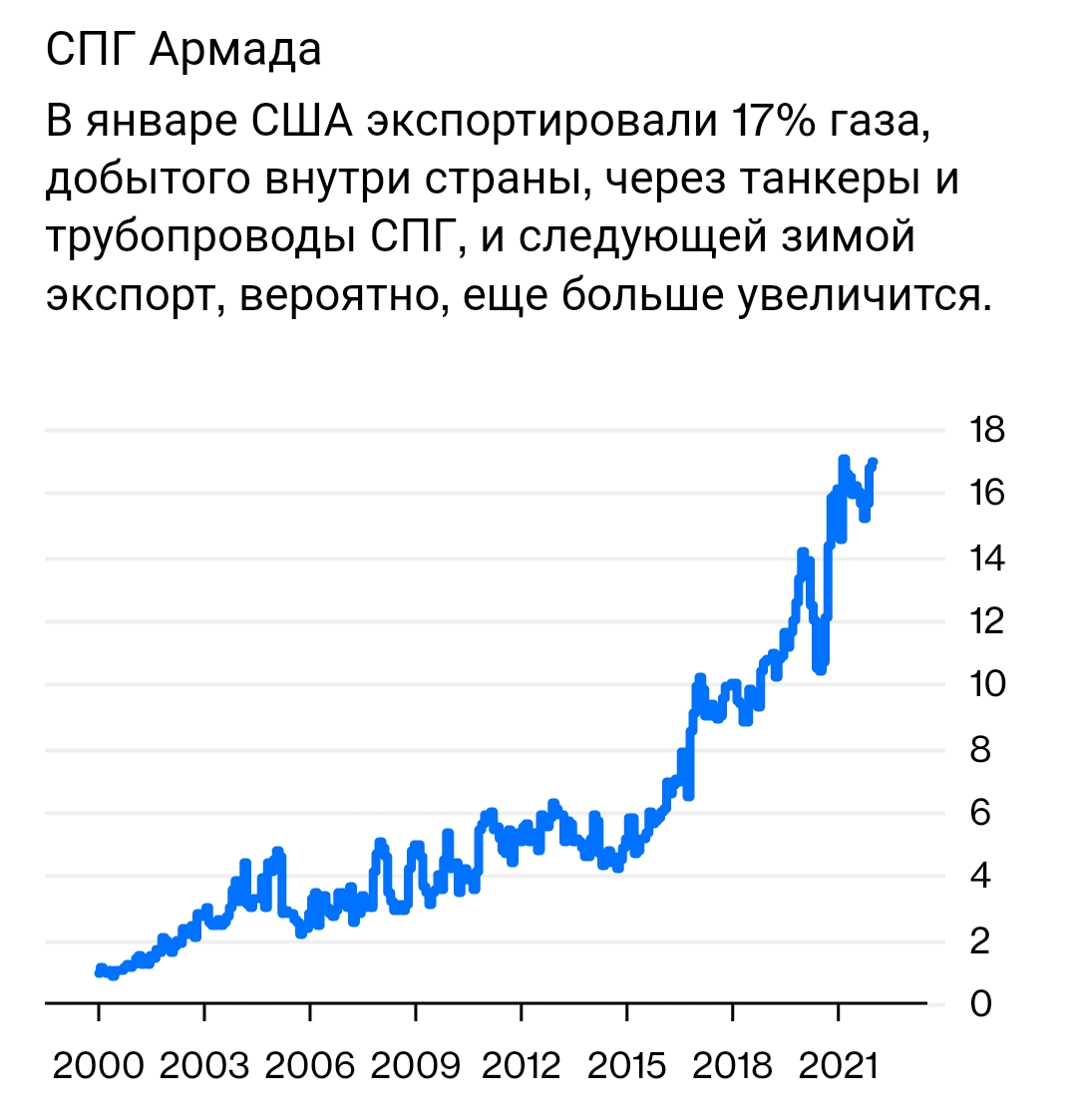 Благодаря всем этим СПГ-терминалам США экспортировали 17% своего внутреннего газа в январе, это последние доступные месячные данные. К следующей зиме Управление энергетической информации США прогнозирует, что каждая пятая молекула газа, произведенного в Америке, будет продана за границу. Два десятилетия назад США практически не экспортировали газ.