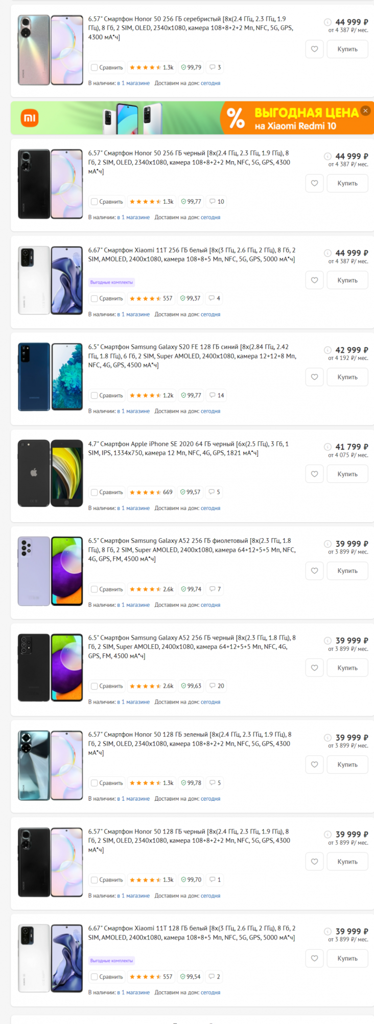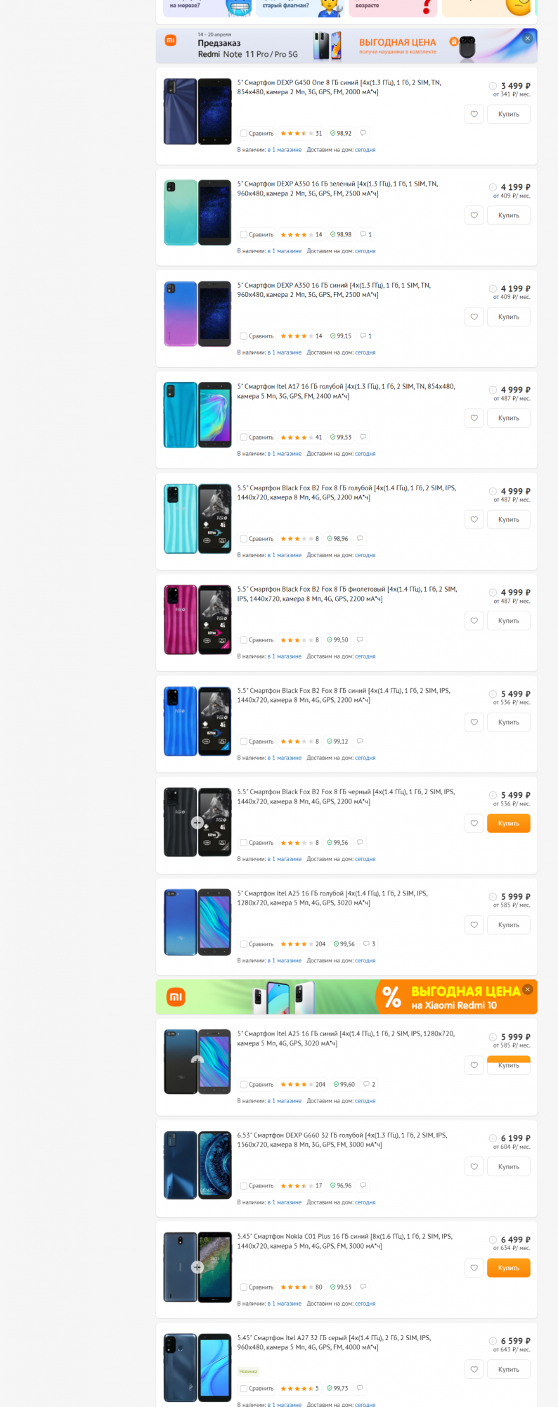 Полно смартфонов. Отсортировано - сначала дешёвые.