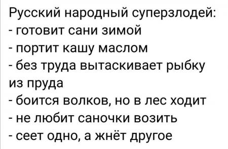 Попался мне давича в интернете мотиватор (автор неизвестен), которым очень хочется поделиться и взрастить в пространстве и времени. Это совершенно блестящий пример борьбы со всякими отрицательными ярлычками, которые навешивает на нас западная пропаганда. См. картинку в заголовке. но изложу здесь текстом. Берем русскую народную пословицу, переворачиваем наизнанку и добавляем к полученному выражению образ фентезийного "суперзлодея".