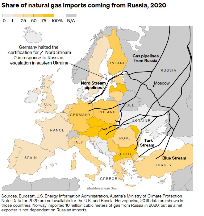 Европа зависит от российского газа для производства одной пятой части своего производства электроэнергии, и незначительный сбой может быстро распространиться по всему континенту. Уровни хранения в настоящее время составляют всего 32% вместимости, по сравнению с целью не менее 80%, необходимых для обогрева домов и работы заводов в течение зимы.