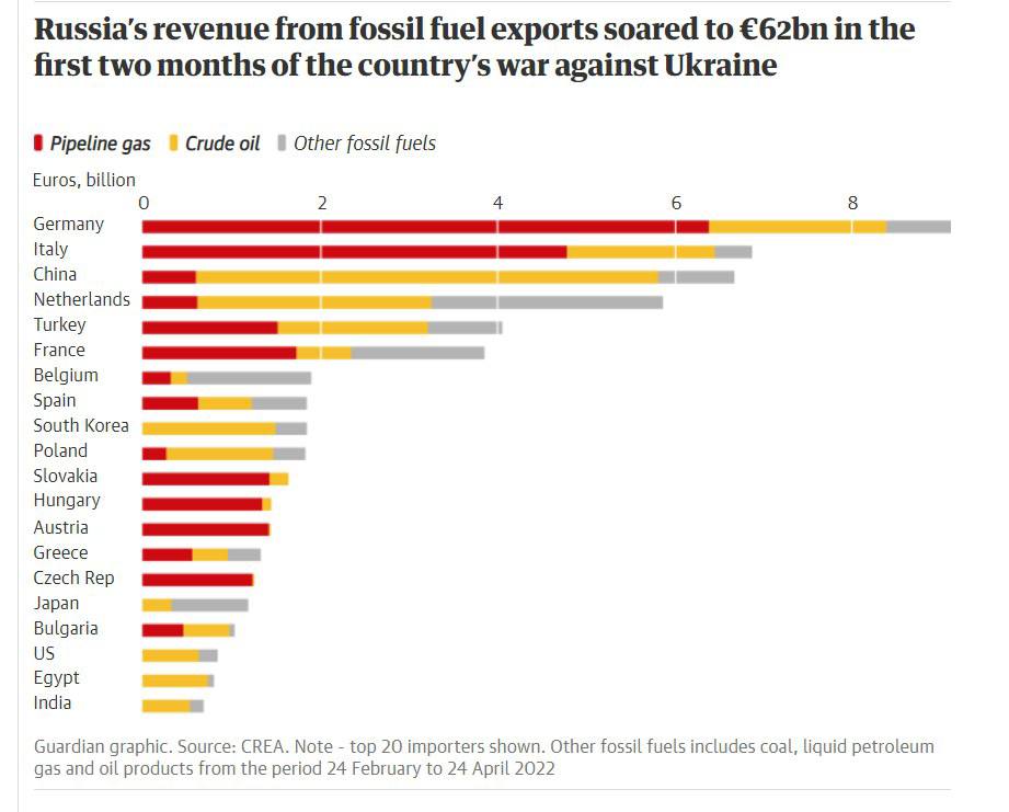 Структура выручки России от экспорта энергоносителей в период с 24 февраля по 24 апреля. Красный цвет - трубопроводный газ, желтый - нефть, серый - иные углеводороды. Всего 62 млрд евро.