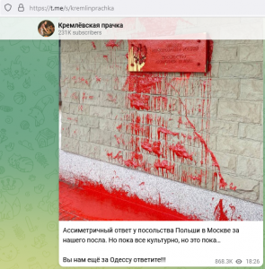 Едва польские дипломаты покинули российский МИД - так какие-то клоуны облили краской табличку польского посольства. И, буквально тот же час, видео вандализма было опубликовано в украинском твиттере, а вечерняя польская пресса перешла к обсуждению "симметричного возмездия" в "российских пропагандистских каналах".