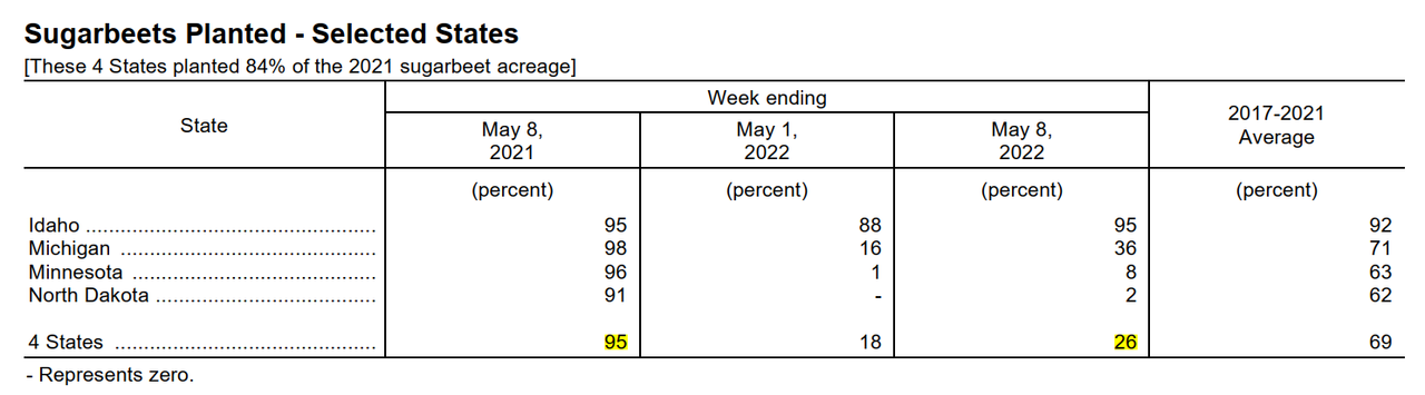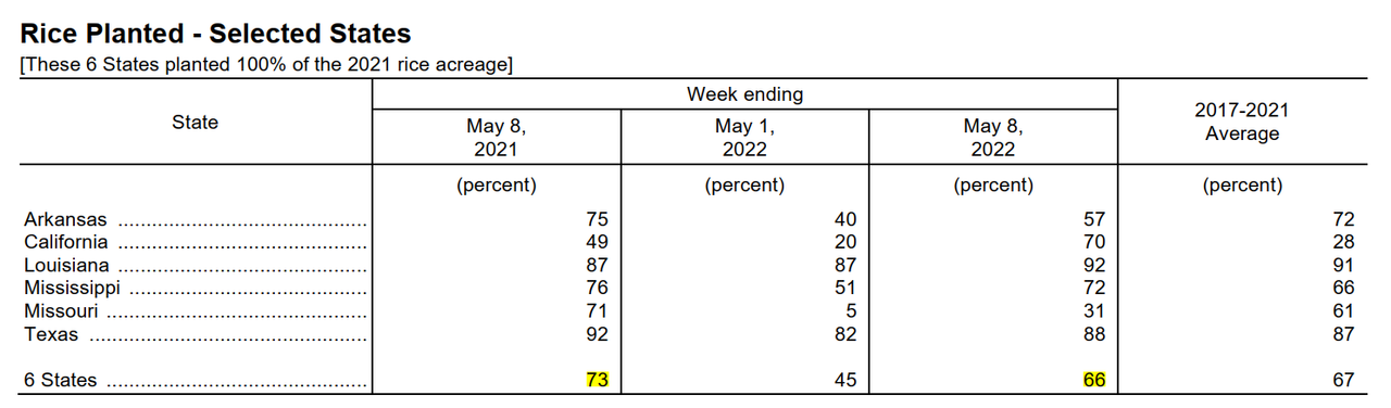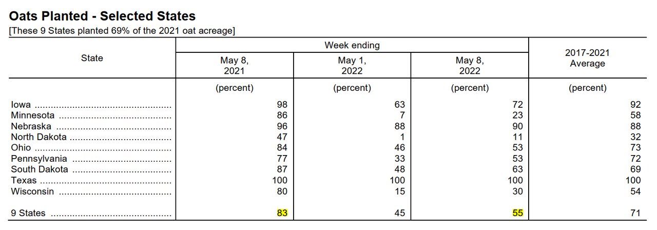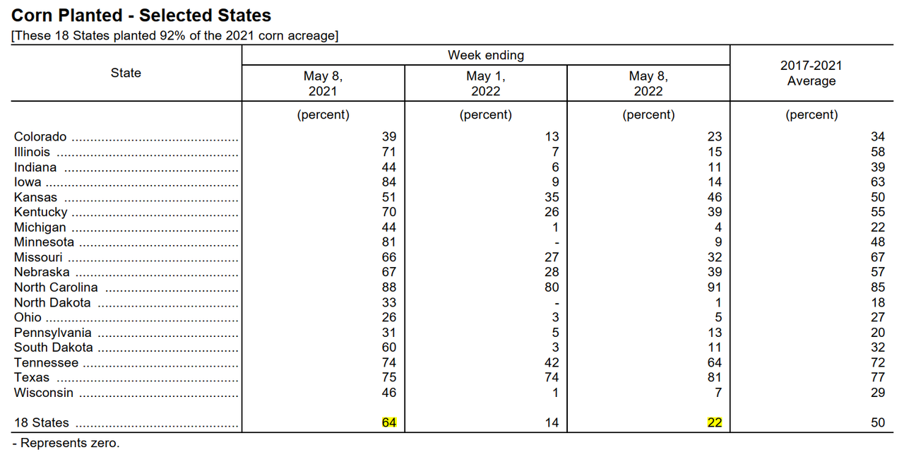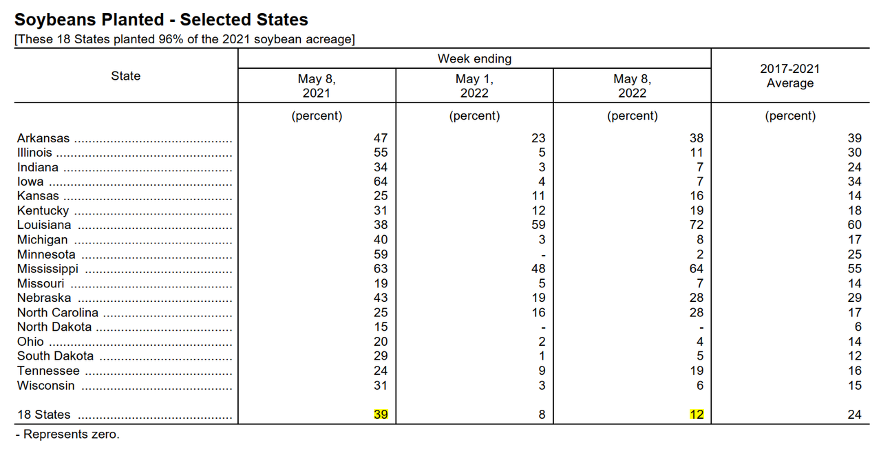 Агенство NASS в понедельник днем сообщило о посевной кукурузы в США на уровне 72% по состоянию на воскресенье по сравнению с 49% неделей ранее и средним пятилетним показателем 79%. Кукуруза Северной Дакоты достигла 20% против 4% неделей ранее и 66% в среднем. По состоянию на воскресенье яровая пшеница в США была засеяна всего на 49%, что является самым низким показателем с момента начала регистрации в 1981 году. Это сопоставимо с 39% на предыдущей неделе и средним показателем 83%. Северная Дакота завершила посев яровой пшеницы на 27% по сравнению со средним показателем 80% и 17% неделей ранее, а Миннесота была завершила всего на 11% по сравнению с 5% на предыдущей неделе и намного ниже среднего показателя в 90%. Эти два штата производят две трети урожая яровой пшеницы в США. В некоторых штатах дела обстоят лучше, чем в других, и многие из них достигли почти нормального уровня посевов кукурузы и сои за последние две недели. В большинстве районов в начале весны наблюдались приступы чрезмерных осадков и низкие температуры, что замедлило полевые работы. Посев сои в США, завершенный на 50%, задерживается гораздо меньше, чем посев кукурузы или пшеницы, учитывая средний показатель 55% на 22 мая. всего 7% закончили по состоянию на воскресенье, что значительно ниже среднего показателя 47%.