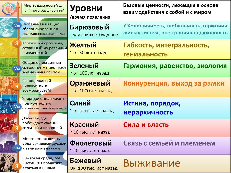 - повышение уровня по шкале эмоциональных тонов (качество эмоциональных состояний) [1] и по спиральной динамике развития сознания [2].