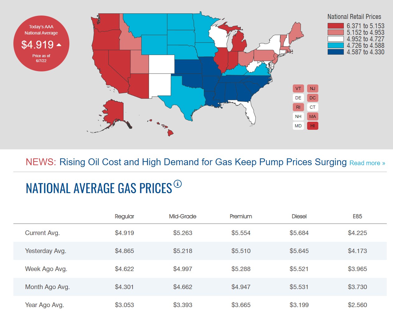 Согласно данным AAA, средний показатель по стране во вторник в размере 4,919 доллара за галлон в сравнении с 4,622 доллара всего неделю назад, 4,301 доллара месяц назад и с 3,053 доллара за галлон в это время в прошлом году.