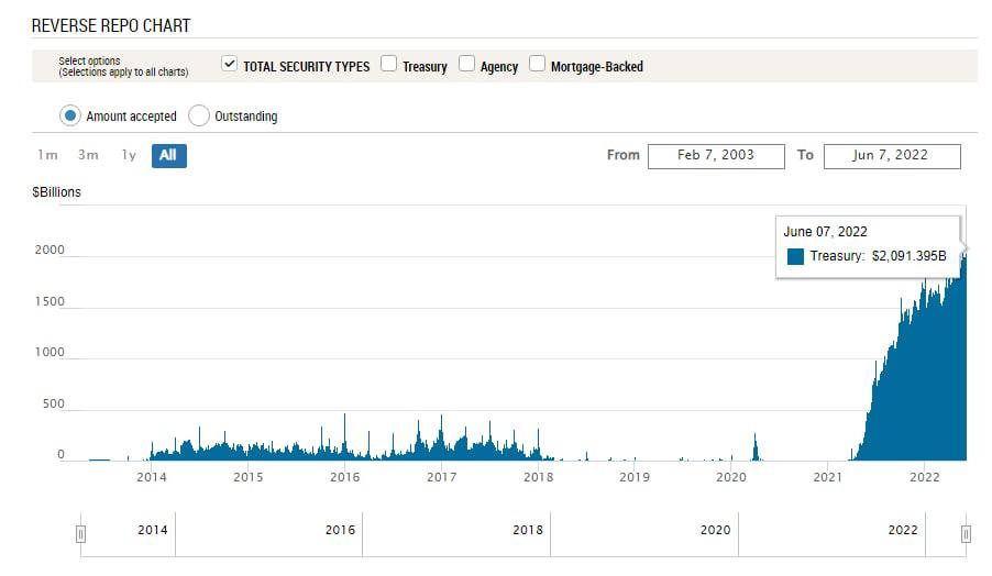 Сделки обратного РЕПО (сделка покупки с обязательством обратной продажи ценной бумаги) американского казначейства сегодня установили очередной исторический рекорд, достигнув суммы 2,091 трлн долл.