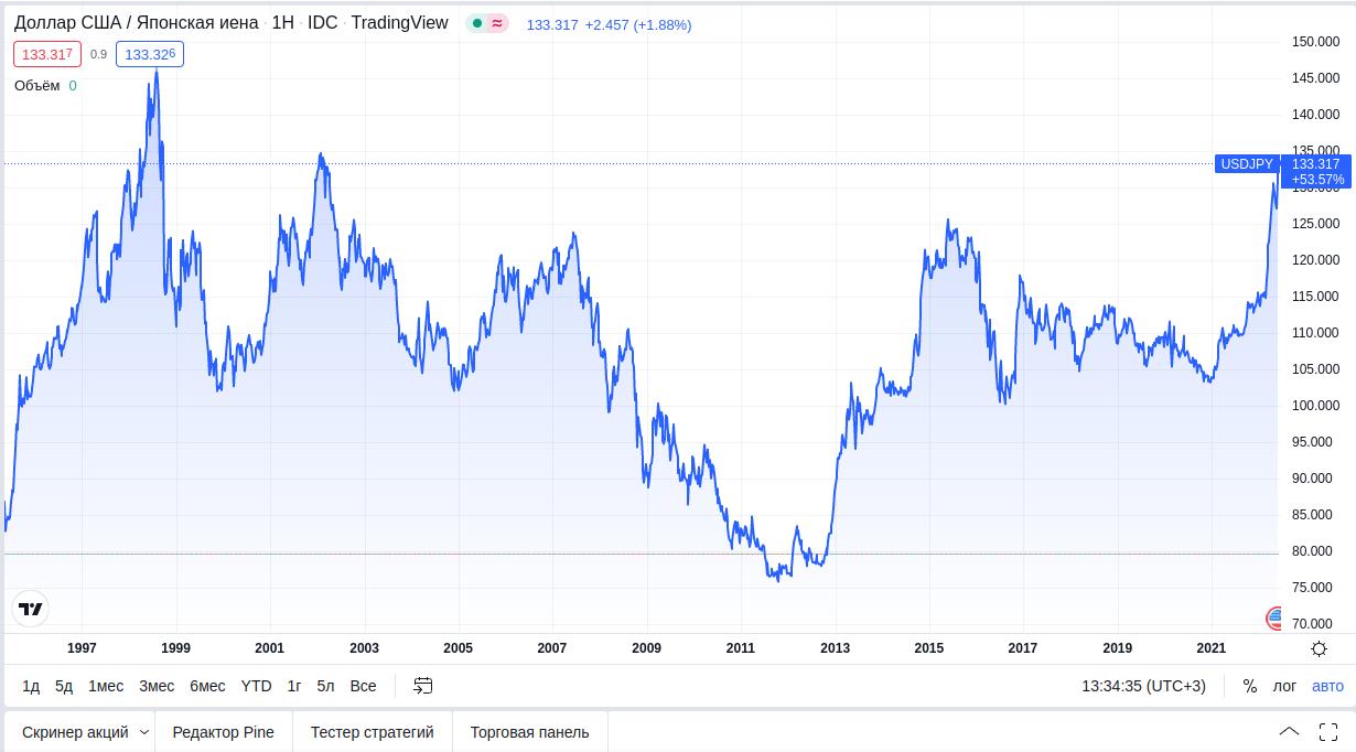 Ну, давайте посмотрим на йену с того же 1995 года. Мне мерещится или с тех пор йена ослабела на 53% и соответственно на столько же укрепился доллар?
