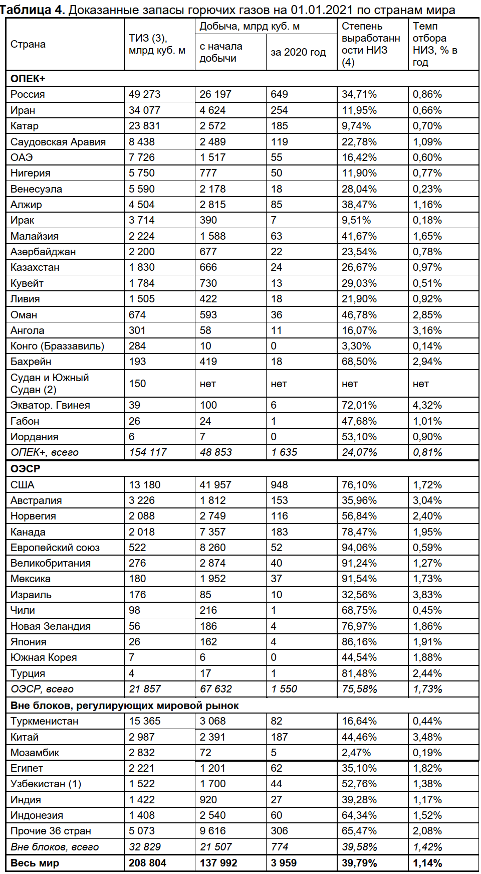 Данные по мировым запасам природного газа и основные сводные показатели разработки месторождений приведены в таблице 4. Это наиболее надежные данные, полученные официальным путем у владельцев этой информации и их официальных представителей. Только по Судану и Южному Судану нет официальных данных, несмотря на то что эти страны входят в соглашение ОПЕК+ и должны были предоставить сведения для общего учета.
