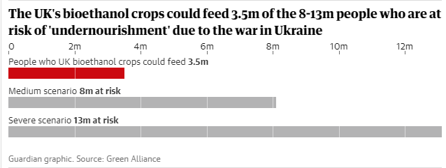 Согласно другому исследованию, опубликованному Зелёным Альянсом [Green Alliance — это независимый аналитический центр и благотворительная организация, ориентированная на амбициозное лидерство в области защиты окружающей среды – прим.пер.] в понедельник, если бы земли за рубежом, используемые для выращивания биоэтанола для Британии, были отданы под продовольственные культуры, можно было бы накормить дополнительно 3,5 миллиона человек в год. Это снизило бы воздействие глобального недоедания, возникшего из-за войны на Украине, на 25-40%, говорится в документе.