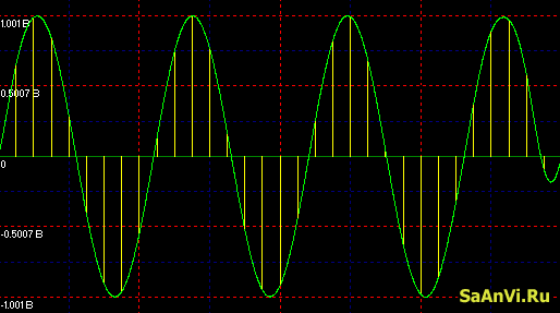 На рисунке зелёным цветом представлен аналоговый, непрерывный сигнал, желтым - его зафиксированные отсчёты (выборки). Выборка - значение сигнала в данный момент времени, записанное цифрой. Поскольку аналоговый сигнал непрерывно меняется во времени, сразу вырисовывается проблема: для точного воспроизведения сигнала необходимо бесконечное количество выборок - "одна за другой".
