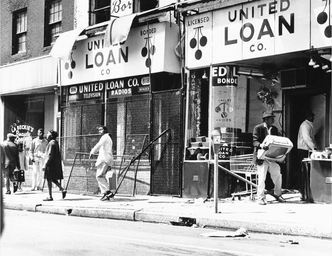 После убийства Мартина Лютера Кинга (в Мемфисе, штат Теннесси) 4 апреля 1968 года в Балтиморе, одновременно с другими городами, вспыхнули массовые беспорядки. В город было введено в общей сложности 11000 национальных гвардейцев и солдат федеральных войск. Балтиморский бунт принес городу убытков на $10 млн. ($80 млн. сегодня) На фото возмущенный убийством Мартина Лютера Кинга гражданин в знак протеста выносит из магазина телевизор. Апрель 1968 года.