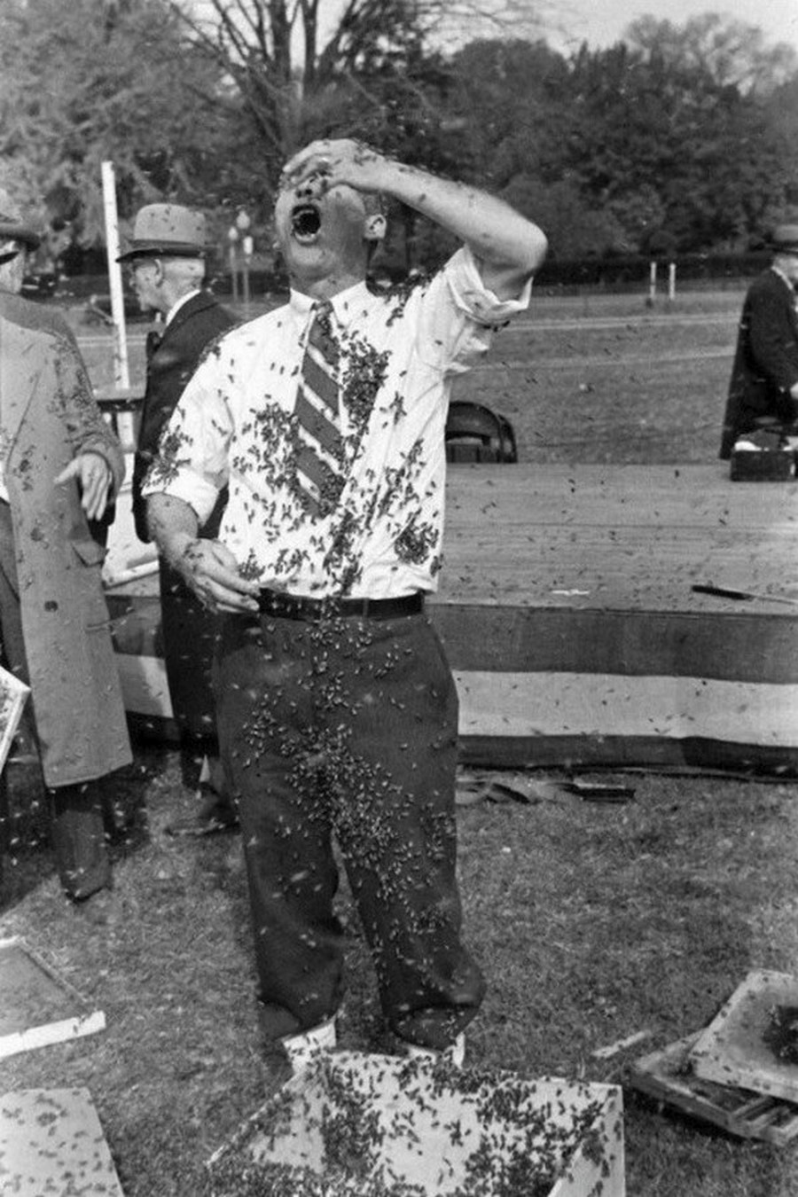 Белый медвежонок обнимает свою мать. Медвежонок весь день и ночь просидел в этом положении, плача и отказываясь от еды. Медведицу убили норвежские моряки во время промысла. Фотография была сделана фотографом Леннартом Нильссоном на Шпицбергене и стала одной из первых его фотографий для опубликованной статьи под названием "Охота на белых медведей", 1947 год.