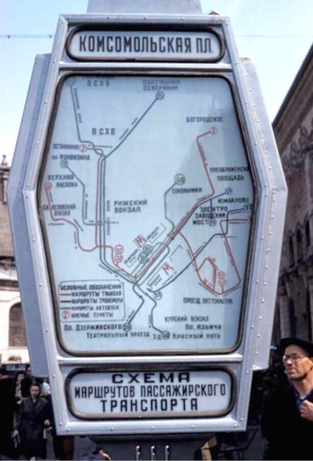 Карта маршрутов трамваев и автобусов на городской улице. СССР, Москва, 1959 год