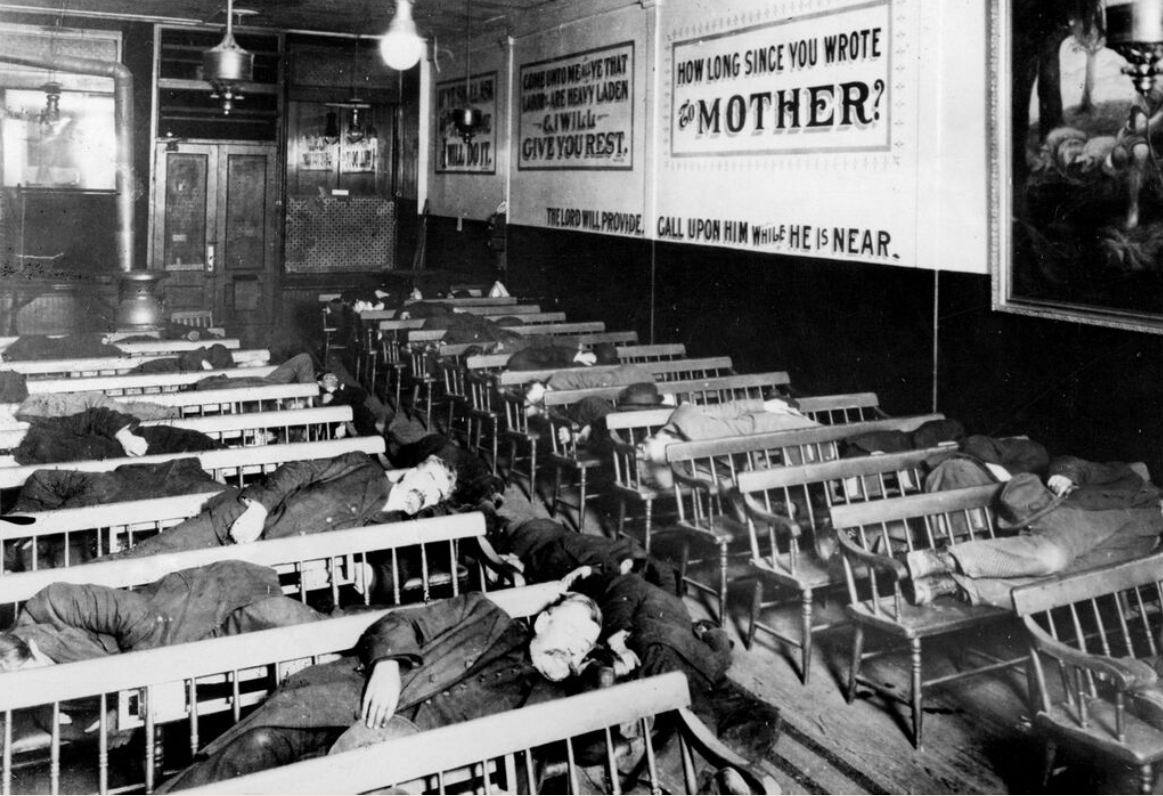 Великая депрессия. Люди потерявшие свое жилье и работу, ночуют в зале для религиозных собраний. Нью-Йорк 1933 год.