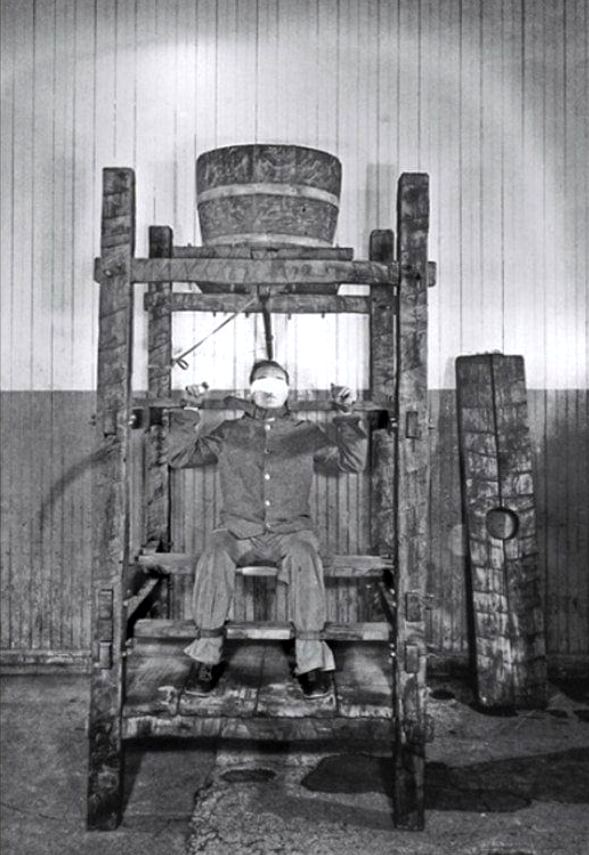 На фото заключённого американской тюрьмы Синг-Синг подвергают китайской пытке водой, 1860 год. Пытка заключается в том, что человека привязывают так, что он не может пошевелиться или пошевелить головой, и в полной темноте ему на лоб медленно капает вода, по капле в минуту где-то. Обычно хватало 20 литров чтобы человек или во всём сознался, или сошёл с ума.