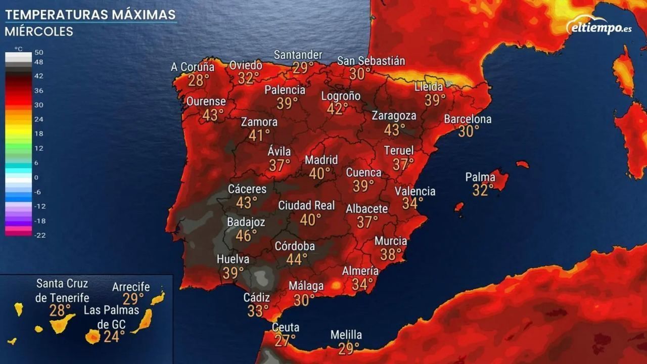 В некоторых районах Испании, например, в провинции Бадахос, термометры могут достичь 46-47ºC, а в некоторых районах долины Гвадалквивир - 44-45ºC.