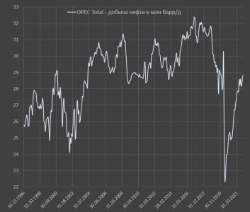 ▪️Текущая добыча стран ОПЕК (28.8 млн барр/д) находится на 22-летнем минимуме, т.к. 28.8 млн добывали в августе 2000 года. При этом мировой спрос на нефть с 2000 года вырос на 25%, т.е. доля ОПЕК резко снижается.