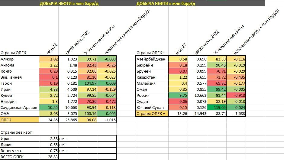Близки к плану: Алжир (99.7%), Ирак (97.1%), Кувейт (99.8%), Саудовская Аравия (99%) и ОАЭ (100%), исполнение квот которых от 97%.