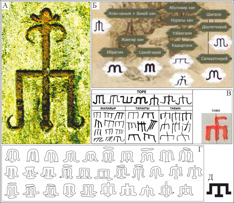 А – тамга на кулпытасе на могильнике Буранчи IV. Б – фрагмент схемы фамильных разновидностей «ханской» тамги казахских торе конца XVIII – начала XIX вв., характеризующий потомков Абулхаира хана Младшего жуза [Рогожинский, 2014]. В – тарак-тамги торе и казахских родов [Рогожинский, 2021]. Г – тарак-тамга на джучидских монетах [Пономарев, 2014]. Д – реконструкция тамги крымских Гиреев.