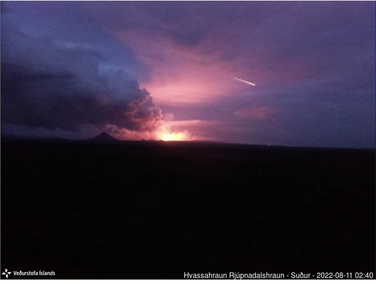 Метеор и извергающийся вулкан Фаградальсфьядль (ИСЛАНДИЯ, 11.08.2022)