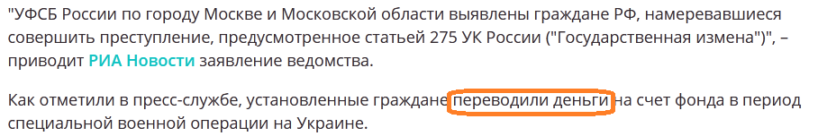 Сегодня СМИ опубликовали сообщение, что ФСБ обнаружило трех россиян, которые в конце февраля перевели деньги этому фонду чем создали условия для совершения преступления, предусмотренного статьей 275 УК России ("государственная измена". – "Ведомости"). В связи с чем этим трем россиянам объявлено официальное предостережение.(источник видео - М24)