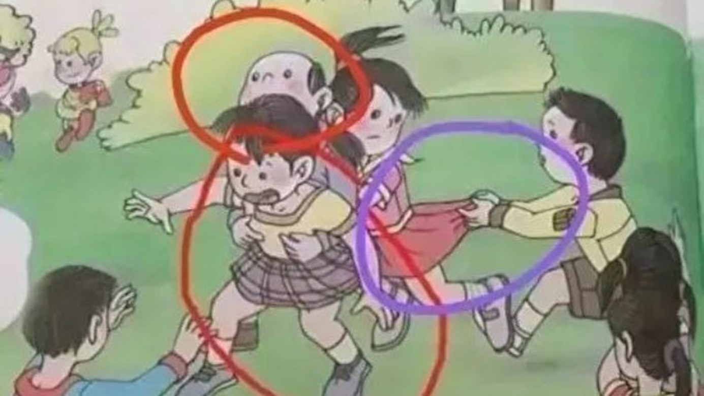 Интересно, что иллюстрации вызвали широкую дискуссию в стране только сейчас, хотя школьники пользуются этими учебниками с 2013 года. Внимание родителей и общественности привлекли изображения, на которых у мальчиков под одеждой заметны очертания гениталий, а также те, где во время игры один мальчик положил руки девочке на грудь, а другой тянет ее за юбку. Еще на одной картинке у девочки, прыгающей через скакалку, из-под юбки выглядывает белье. Негодование также вызвали лица с нарочито округлыми глазами и с высокими лбами. На изображении государственного флага КНР оказались неправильно нарисованы звездочки, а где-то вообще появляется изображение флага США.