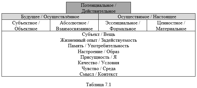 Итак, первую противоположность мы расшифровали как «субъект / вещь». Таким путём пойдём далее по остальным противоположностям.