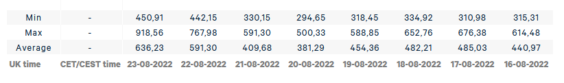 Цены в Великобритании всего за неделю выросли в 1,5 раза, достигнув на 23 августа уровня 750 евро/МВт*ч, а максимальные цены в течении дня подобрались к 1 100 евро/МВт*ч.