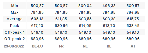 (в таблице ниже указаны минимальные, максимальные и средние цены на 23.08.22г. для ФРГ, Франции, Нидерландов, Бельгии и Австрии соответственно)