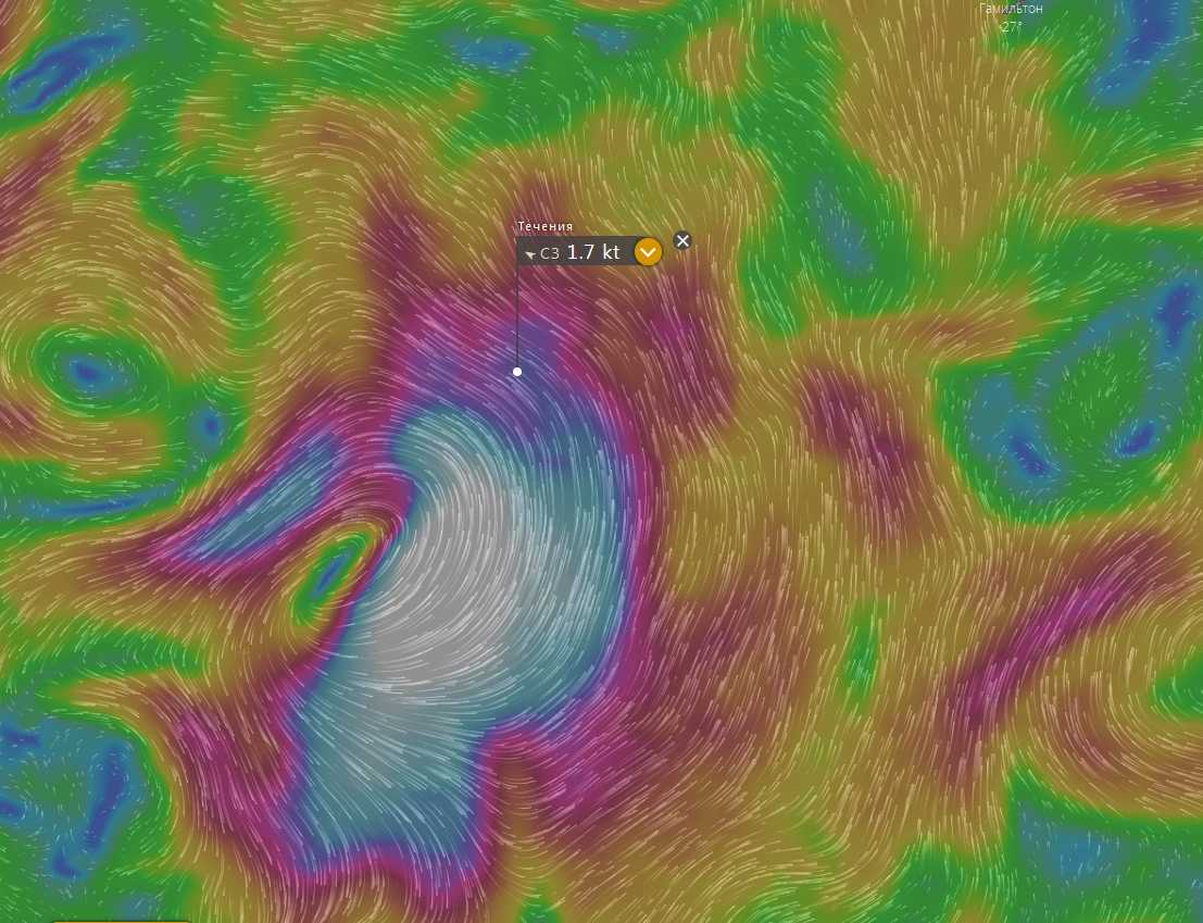 Также течения у поверхности чуть огозападнее имеет градиент с зоной максимальных порывов ветра почти в 2 раза, 1,5 узла.
