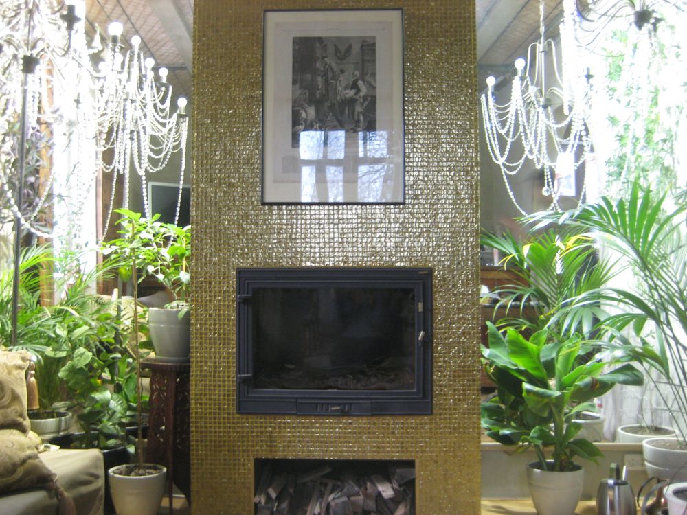 Камин с готовой чугунной топкой. построен мною по эскизу жены. Торшер сделан мною же по эскизу жены. Плитку на камин клеили вдвоем. А рисунок на камине - страница из "Харперс Базар" 1860-какого-то года, куплена на ебее.